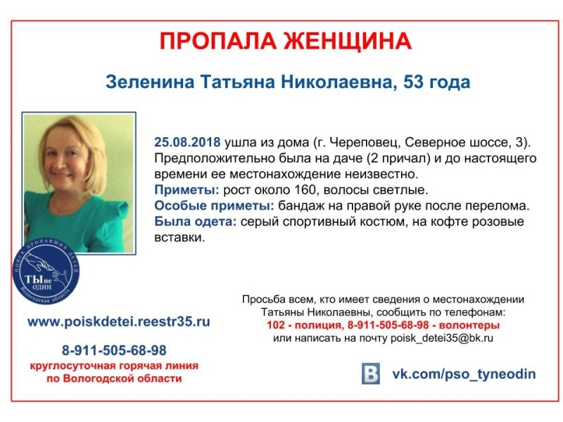 Приметы пропавшей: рост около 160 см, светловолосая, особый признак — бандаж на правой руке после перелома. Была одета в серый спортивный костюм с розовыми вставками на кофте. Всех, кто может что-то рассказать о судьбе Татьяны Зелениной, просят позвонить по телефону полиции 102, либо на горячую линию волонтеров ПСО: 8911-505-68-98, также можно написать на электронную почту poisk_detei35@bk.ru, сообщает ИА «СеверИнформ».