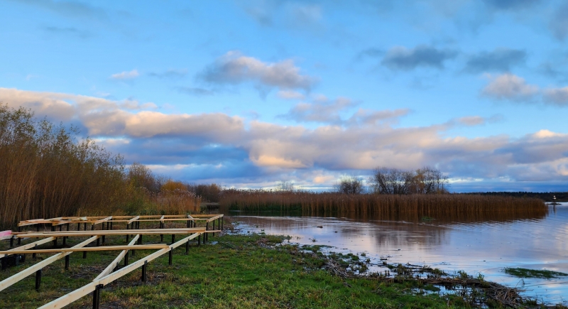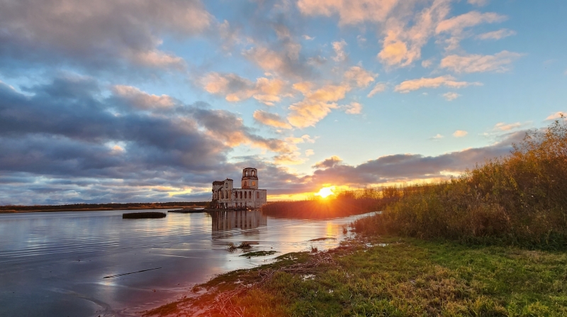 «В прошлом году на этом месте был сплошной молодой ракитник, а подход к нему - непроходимое болото. Первопроходцы-волонтёры выпиливали заросли, носили ветки и расчищали площадку под будущую архитектурную 20-метровую инсталляцию на берегу реки Шексны с названием старинного посада Крохино. Мы мечтаем вернуть имя затопленному селу, а также привлечь внимание и поддержу храму-маяку», - говорят организаторы проекта.