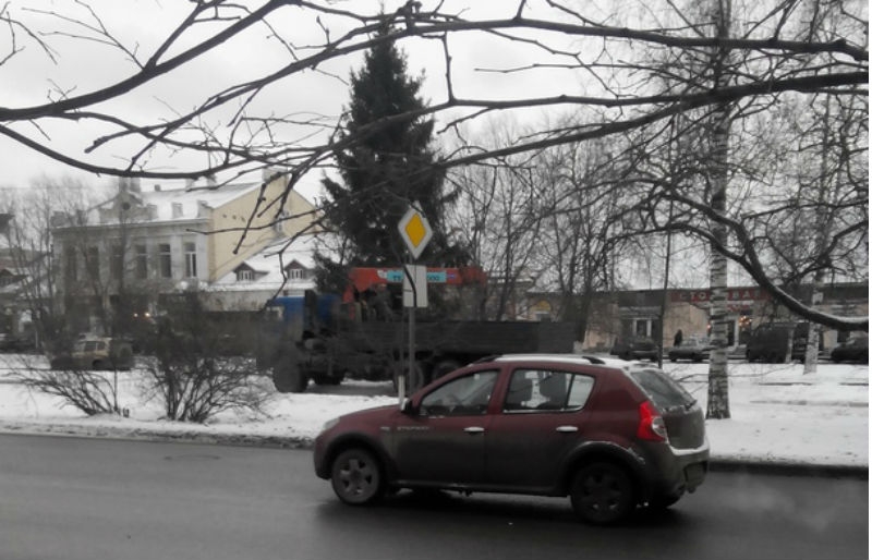 Вологжанин Сергей Мельников разместил фотографии, как ель подвозит большегруз и ее снимают с машины. Судя по снимкам, елка будет стоять на круглой клумбе посредине аллеи.