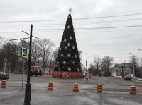Установка каркаса заняла почти неделю. Теперь осталось повесить на искусственную ель последние украшения, как раз сегодня на площади вновь стоит вышка, рабочие завершают процесс. Огни на елке будут гореть с 17-18 часов до утра.