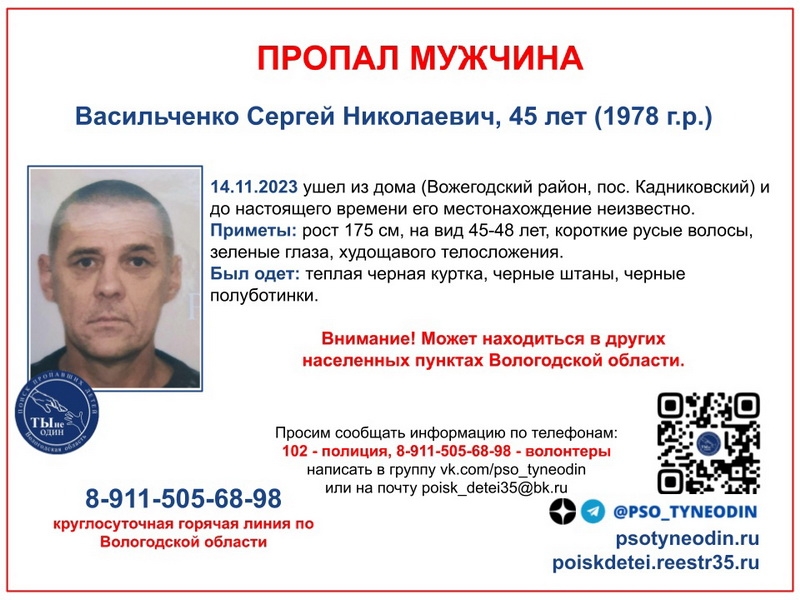 В поисках принимают участие волонтеры группы «Ты не один». Вся информация о пропавшем принимается по телефонам 911-505-68-98 или 02, сообщает ИА «СеверИнформ».