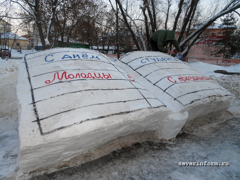 «На выходных кто-то разрушил «зачётку». Правда, ещё в субботу днём я видел, как по «книжке» катались дети на санках-ледянках. Но от этого даже надпись не стёрлась, так как мы залили поверхность скульптуры водой. Видимо, в субботу вечером композицию кто-то развалил, но это пусть останется на их совести. Главное, что этот подарок мы готовили на День студента, а 25 числа зачётка ещё была целая», - рассказал куратор проекта Игорь Олейников.