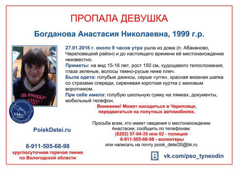 Всем, кому известно что-либо о местонахождении подростка, просьба позвонить по указанным в ориентировке телефонам. Позднее стало известно, что девушка нашлась.
