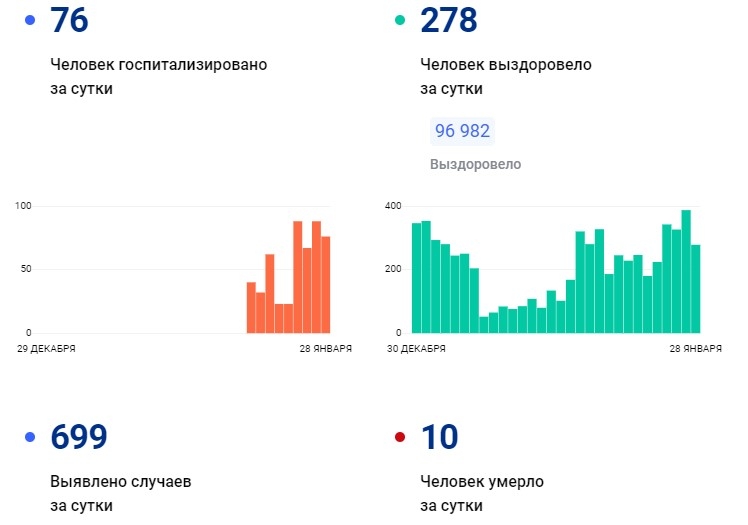 Выздоровели почти 97 тысяч пациентов, включая 278 человек за минувшие сутки. Госпитализировали 76 вологжан. Скончались 10 больных, а общее количество жертв в области достигло уже 3181. Данные на утро 28 января опубликованы на сайте стопкоронавирус.рф.