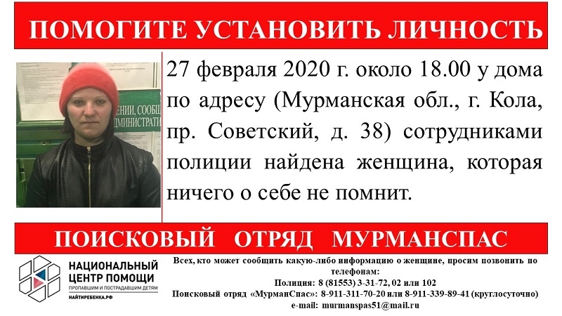 В городе Кола Мурманской области волонтеры и полиция устанавливают личность женщины с амнезией. По информации поисково-спасательного отряда «Мурманспас», незнакомку обнаружили вчера, 27 февраля, у дома №38 на Советском проспекте, сама она утверждает, что ничего о себе не помнит.