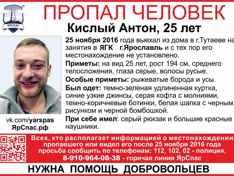 В Ярославской области разыскивается Антон Кислый. 25-летний мужчина выехал их дома в Тутаеве 25 ноября 2016 года в Ярославль, с тех пор о нём ничего не слышно.
