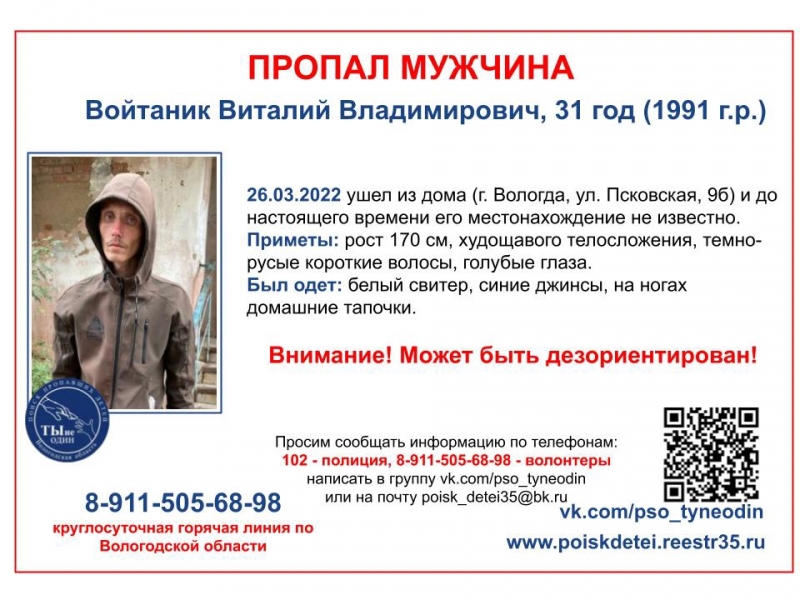 Известно, что вологжанин живет на Псковской, 9Б. Мужчина ростом 170 сантиметров, худощавого телосложения, с короткими русыми волосами и голубыми глазами. Был одет в белый свитер, синие джинсы и домашние тапки.