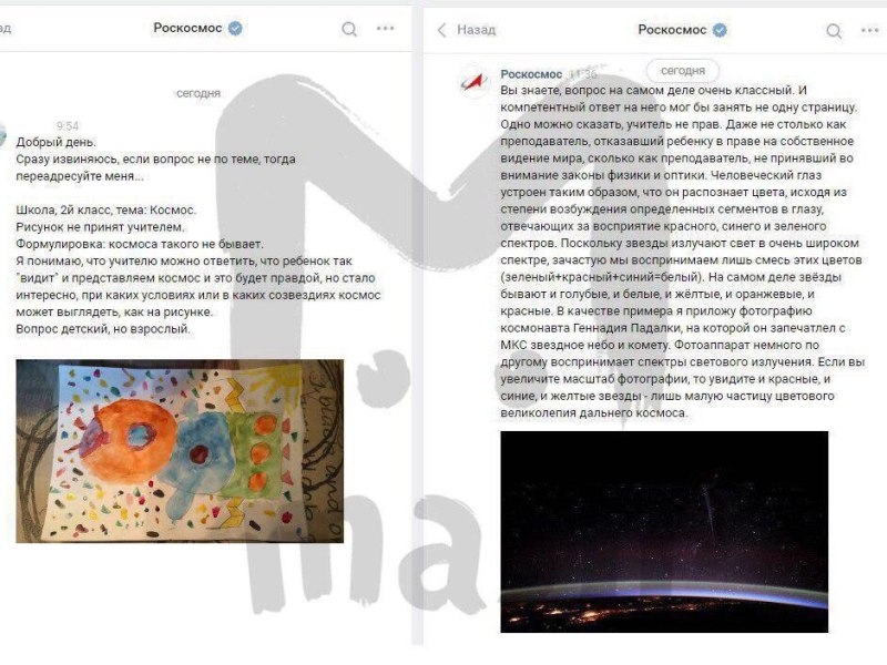 «Я понимаю, что учителю можно ответить, что ребенок так «видит» и представляет космос и это будет правдой, но стало интересно, при каких условиях или в каких созвездиях космос может выглядеть, как на рисунке», - написал он в официальное сообщество «Роскосмоса» в соцсетях.