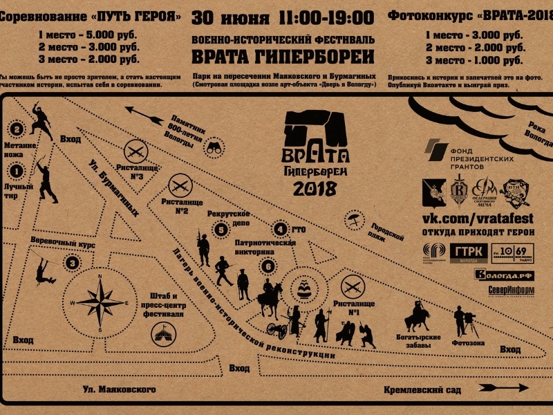 III Военно-исторический фестиваль «Врата Гипербореи» пройдет в Вологде 30 июня. Основной площадкой станет парк на набережной реки на пересечении улиц Маяковского и Бурмагиных. Организатор мероприятия – Вологодская общественная организация «Исток» при поддержке Фонда президентских грантов. Информационная поддержка мероприятия - ИА "СеверИнформ".