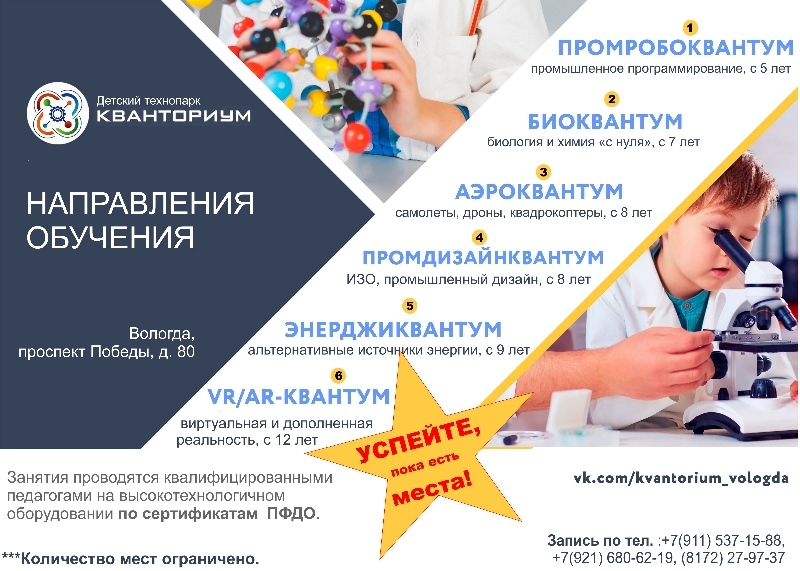 По словам заместителя мэра Вологды по социальным вопросам Вадима Цепы, "Кванториум" войдет в структуру детско-юношеского центра "Лидер". Для бесплатных занятий доступно порядка 1000 мест. Из числа записавшихся большинство хочет учиться в промробоквантуме, биоквантуме и энерджиквантуме.