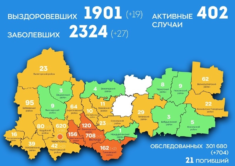 По информации департамента здравоохранения Вологодской области на утро 28 июля в регионе 2 324 подтверждённых случая коронавирусной инфекции. За сутки 27 : 18 – Череповец, 3 - Вологда, по 2 в Череповецком и Грязовецком районах, по одному в Сокольском и Кадуйском.