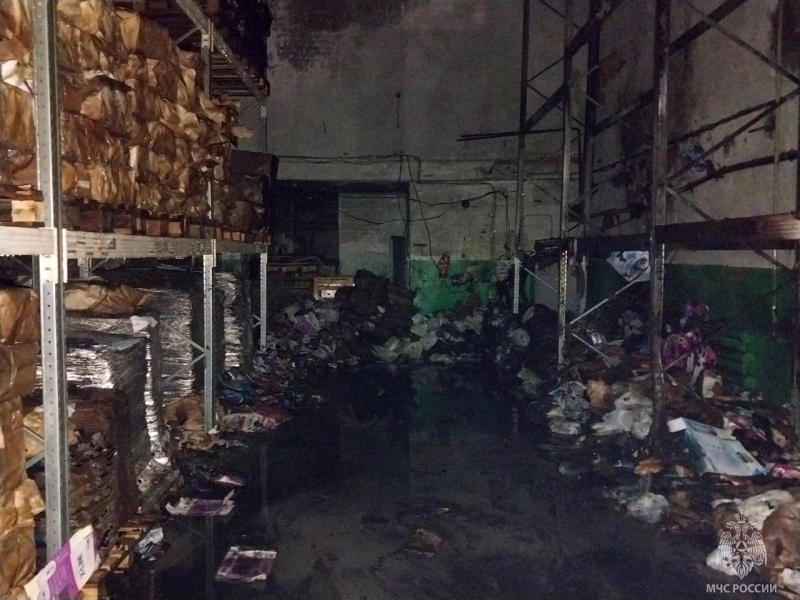 Сгорели коробки, частично закопчена внутренняя отделка и металлические конструкции стеллажа. На вызов выезжали 32 человека и 10 единиц техники.