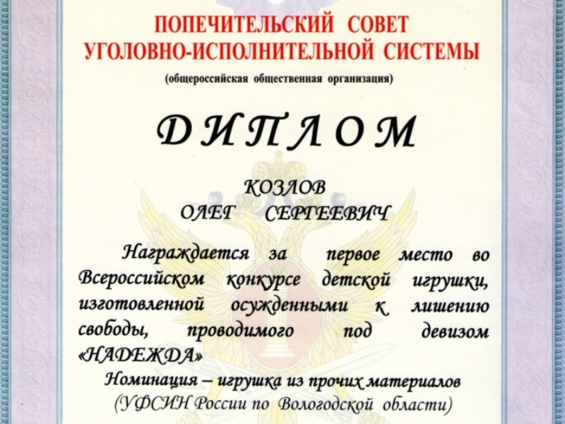 Олег Козлов на конкурсе завоевал диплом за первое место. Кроме того, дипломом «За участие» была награждена осужденная ИК -1, расположенной в Вологде, Татьяна Сквознякова. Она отправляла для участия в конкурсе две плюшевые игрушки.