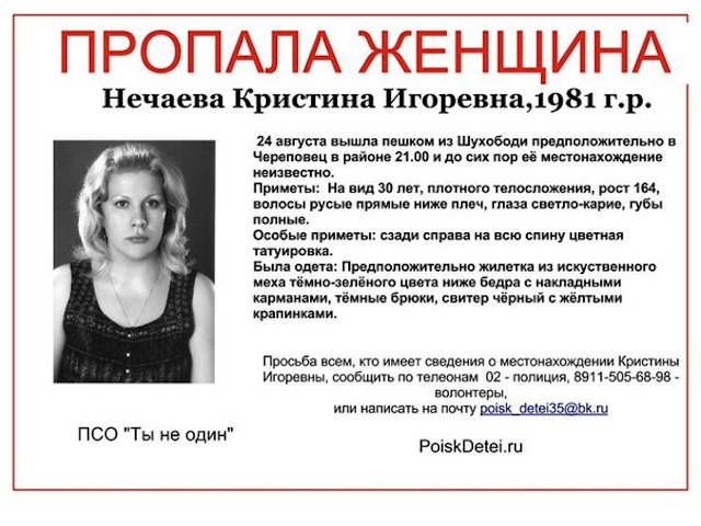 ищут в Череповецком районе. Кристина Нечаева ушла из Шухободи еще 24-го августа. По словам знакомых, женщина отправилась пешком в Череповец. С тех пор ее