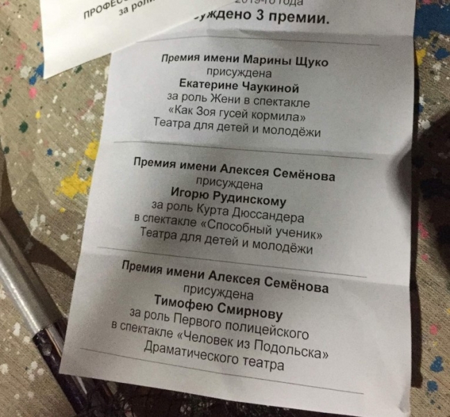 Итак, премия имени Алексея Семенова «За мужскую роль» сегодня вручена актёру Вологодского драматического театра Тимофею Смирнову, который сыграл Первого полицейского в спектакле «Человек из Подольска».