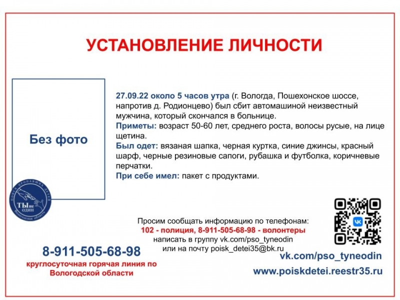 Необходима помощь в установлении личности умершего. Мужчине на вид 50-60 лет, он среднего роста, с русыми волосами, на лице щетина. Был одет в черную куртку, синие джинсы, красный шарф, черные резиновые сапоги, вязаную шапку, рубашку и футболку, коричневые перчатки. С собой взял пакет с продуктами.
