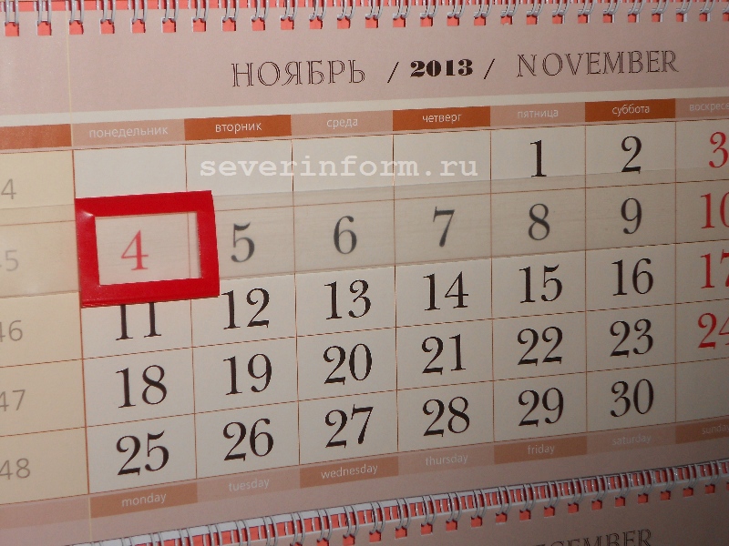 В этот день Россия отмечает День народного единства. В 2013 году он выпал на понедельник. Больше в ноябре дополнительных выходных не предвидится. Да и новогодние каникулы 2014 года будут не такими уж длинными. Отдыхать россияне будут с 1 по 8 января, сообщает ИА «СеверИнформ» со ссылкой на «Российскую Газету».