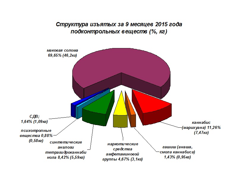 Почти 70% из изъятых веществ составляет маковая солома. Еще 11% - каннабис или марихуана. 8% - синтетические наркотики, 4,6% - амфетамины, около 2% - СДВ, 1,43% - гашиш и менее 1% - психотропные вещества, сообщает ИА «СеверИнформ».