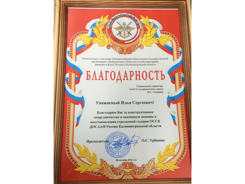 Наряду с АО «33 судоремонтным заводом» почетное место на памятной доске «за помощь в восстановлении стрелковой галереи» заняли такие предприятия как ОАО «Калининграднефть» федерация практической стрельбы, ЗАО «Гленар», Союз ветеранов органов безопасности «Резерв», ООО «Юнайтед консалтинг», ООО «К-Марин» предприниматель А.Ф. Цветков.