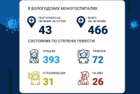 В моногоспиталях Вологды на лечении находится 466 пациентов, в том числе 43 поступило за минувшие сутки. В больнице на Советском проспекте лечится 326 человек, на Северной - 141 пациент. Средняя степень тяжести у 393 заболевших, 72 тяжело переносят болезнь, 31 человек находится в реанимации, 26 из них на ИВЛ.