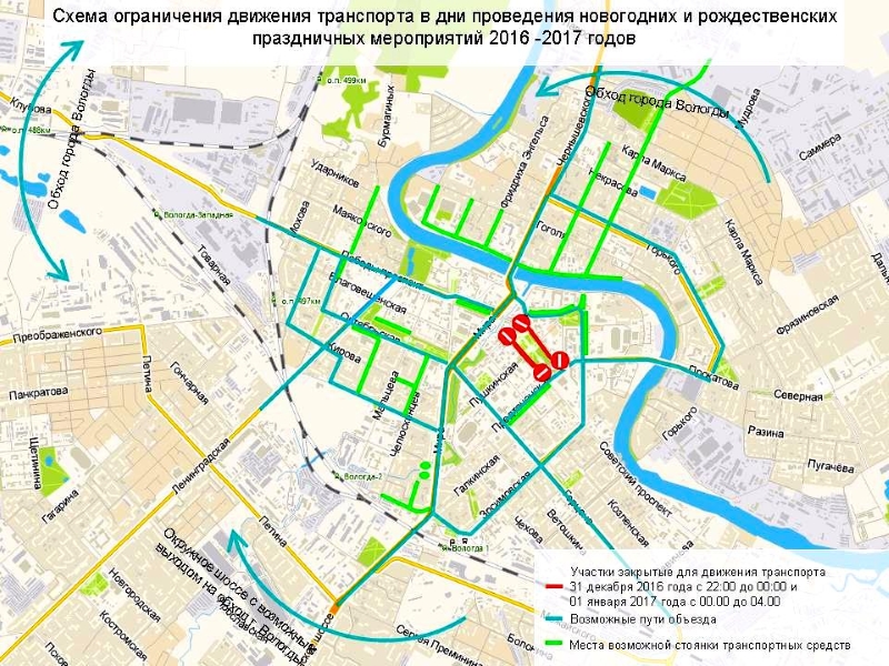 В центре Вологды ограничат движение транспорта в новогоднюю ночь. Проезд для машин закроют с 22:00 31 декабря до 04:00 1 января.