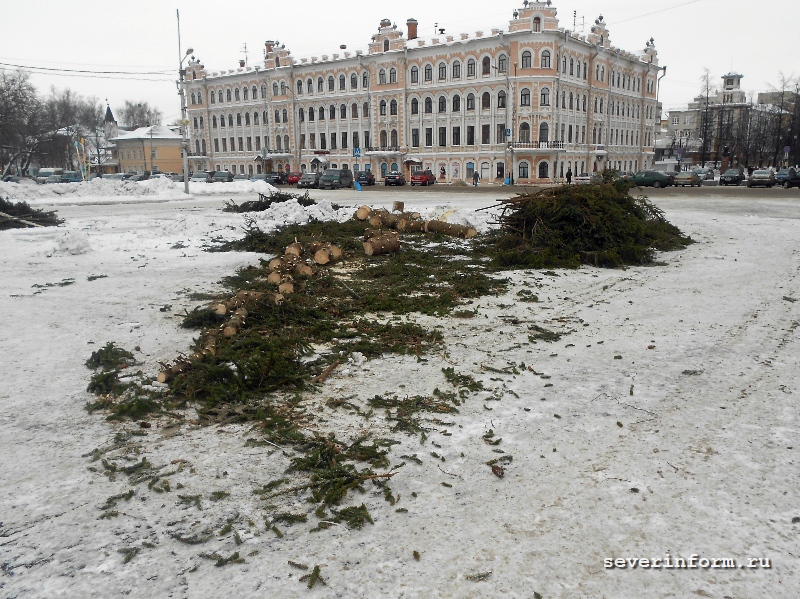 Главную ёлку распилили в центре Вологды. Как сообщает ИА «СеверИнформ — Новости Вологды», утром во вторник, 29 января, ствол дерева распилили на чурбаки, чтобы отправить на растопку котельных и обогрев бань МУП «Ока». Ветки праздничной ёлки сохранят до масленичных гуляний. В праздник их положат под чучела, чтобы те лучше горели. В этом году организаторы мероприятия подготовили сразу семь кукол. Сейчас на площади Революции, где была установлена ёлка, остались только ветви дерева и несколько чурбаков.