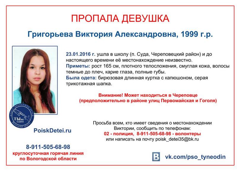 Школьницу, пропавшую в Череповецком районе, нашли. Девушка жива и здорова. Напомним, 16-летняя Виктория Григорьева ушла в школу в поселке Суда, но домой вовремя не вернулась. Это произошло еще 23 января. Через несколько дней были организованы поиски подростка, сообщает ИА «СеверИнформ».