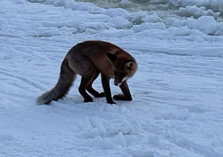 Раненого зверька заметили на реке днем 28 января. Раненая лисица пряталась в кустах и поджимала лапку.