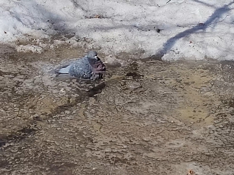Несмотря на то, что днем температура повышается до +10, ночи все еще холодные. Но голубю, видимо, надоело ждать весну, чтобы почистить перышки. И делал он это так заразительно, что привлек внимание других птиц. Но вот только сородичи не рискнули с упоением плюхнуться в лужу, где реально плавает лед.