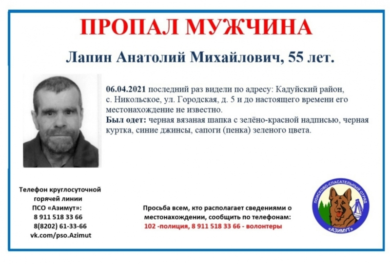 55-летнего Анатолия Лапина последний раз видели 6 апреля в доме на улице Городской, 5 села Никольское. С тех пор местонахождение неизвестно. Информацию о поиске распространяет ПСО "Азимут".
