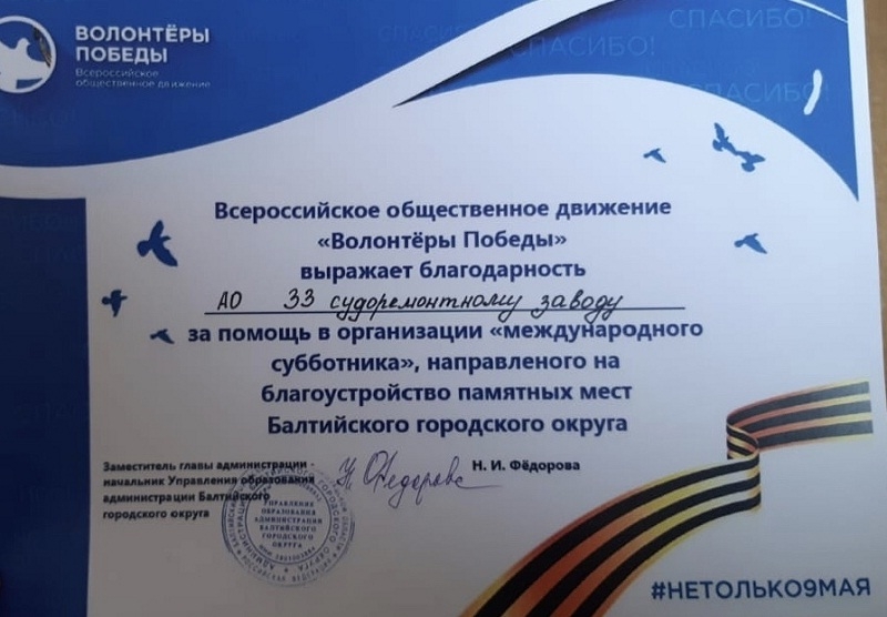 Перед стартом акции ребятам была продемонстрирована военно-патриотическая экспозиция, а также вручена награда коллективу АО «33 судоремонтный завод» за помощь в организации «международного субботника», направленного на благоустройство памятных мест Балтийского городского округа, сообщает ИА «СеверИнформ».