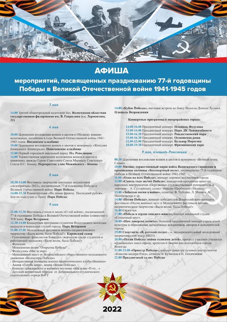 Отмечать праздник вологжане начнут 5 мая. В филармонии состоится третий общегородской кадетский бал. На 6 мая запланированы возложения цветов и венков к городским мемориалам, а также первый городской школьный парад.