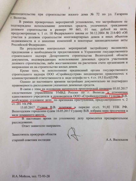 «В ходе проведенных прокуратурой Вологодской области проверочных мероприятий установлено, что застройщик ООО «Стройиндустрия», единственным учредителем и руководителем которого является Вячеслав Гудков, до сих пор не подтвердил правомерность расходования средств участников долевого строительства в размере более чем 99 миллионов рублей. Это послужило поводом для возбуждения против него уголовного дела по признакам преступления, предусмотренного статьей 201 УК РФ - «Злоупотребление полномочиями», - говорится в ответе прокуратуры области на депутатский запрос.
