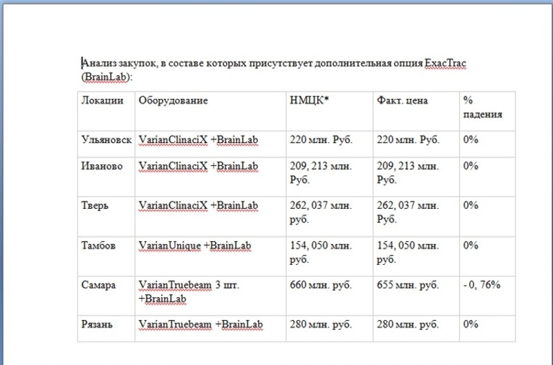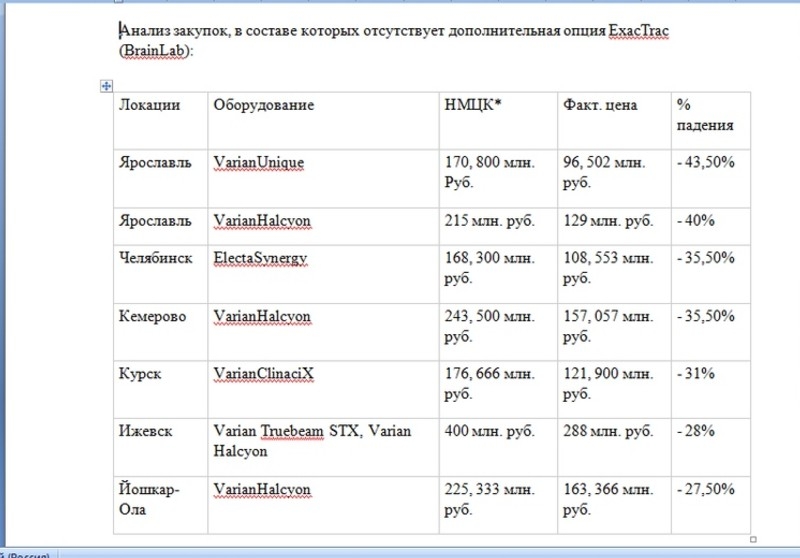 Анализ закупок, в составе которых отсутствует дополнительная опция ExacTrac (BrainLab) показал, что в некоторых случаях процент падения экономии составлял до 43. Исследования проводились в Ульяновске, Иваново, Твери, Тамбове, Самаре, Рязани, Ярославле, Курске, Челябинске, Йошкар-Оле, Смоленске, Ижевске, Кемерово. Курске, Оренбурге и Кирове.