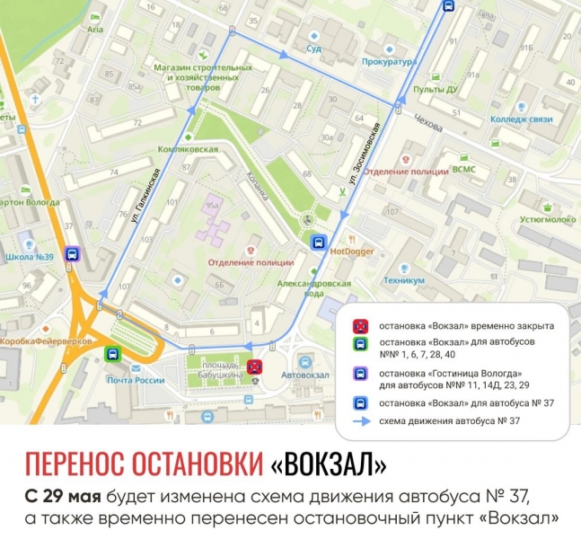 Автобусы № 1, 6, 7, 28, 40, съезжая с Пошехонского моста, будут останавливаться у Почтампта. Там появится соответствующий дорожный знак. А вот автобусы № 11, 14Д, 23, 29 будут высаживать пассажиров у гостиницы «Вологда» на Мира. Автобус №37 будет ходить до памятника «Зенитка». С 26 мая изменена схема движения троллейбуса №4.