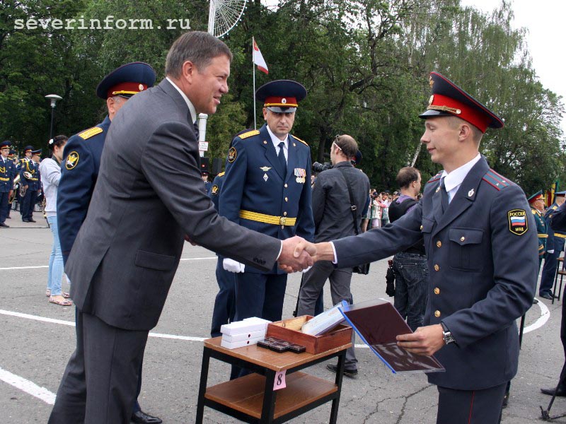 Прибывший на мероприятие губернатор Вологодской области Олег Кувшинников лично вручил дипломы студентам, которые окончили учебное заведение "на отлично". Под звон монет курсанты попрощались с учебным заведением, станцевали вальс и спели песню «Господа офицеры». Затем перед публикой выступил созданный в этом году оркестр барабанщиц, которые буквально покорили публику.
