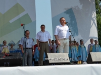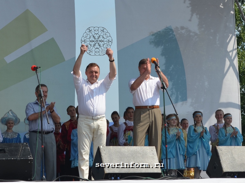 Официальное открытие Дня города состоялось в полдень на Соборной горке. В церемонии приняли участие первые лица города и области. Председатель ЗСО подарил Евгению Шулепову санки. А Олег Кувшинников Главе Вологды вручил кованую снежинку.