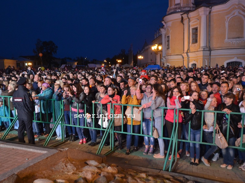 Перед салютом с Днем города вологжан поздравил Евгений Шулепов. Прямо со сцены глава города позвонил мэру Череповца и попросил толпу признаться в любви Вологде, после чего небо озарили яркие вспышки фейерверка.