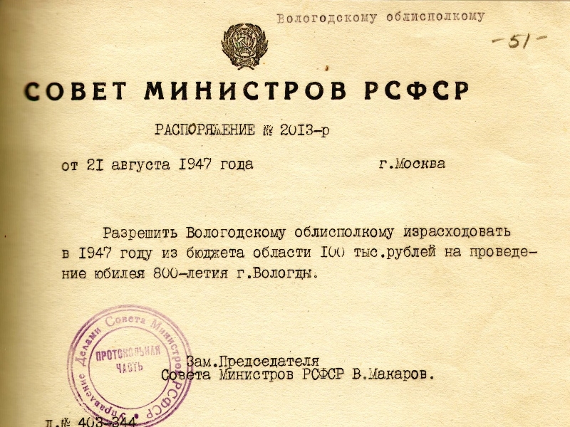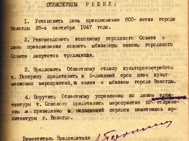 Один из самых ярких Дней города пришелся на 1947 год, когда Вологда совместно с Москвой отмечала свой 800-летний юбилей. По распоряжению Совета Министров РСФСР на проведение юбилейных мероприятий в Вологде из областного бюджета было выделено 100 тысяч рублей. Вологодский облисполком своим решением установил дату празднования – 28 сентября. Подготовкой мероприятий занималась специальная комиссия во главе с председателем Вологодского горисполкома Семеном Гоглевым.