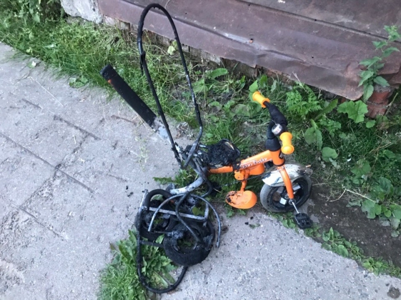 Хулиганы сожгли детский велосипед, оставленный на лестнице