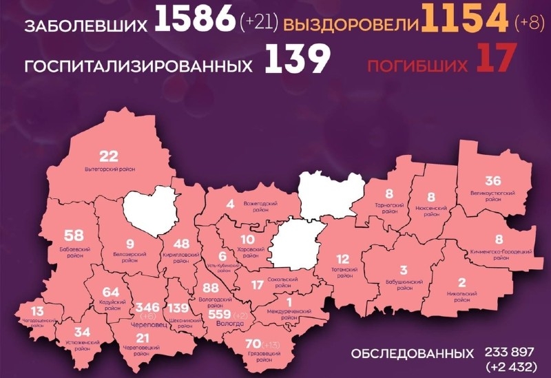 На утро 29 июня в регионе зафиксировано 1 586 подтверждённых случаев коронавирусной инфекции, в том числе за сутки 21 новый случай: 2 – Вологда, 6 – Череповец, 13 – Грязовецкий район. Во всех остальных районах заболевших нет. Выздоровело - 8, рапортует областной департамент здравоохранения.