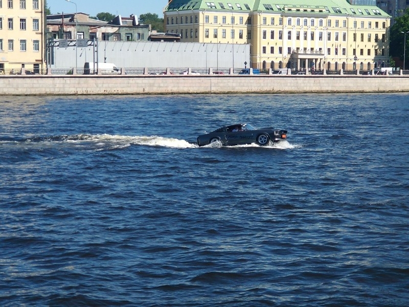 Фотографии плавающего Мустанга появились в соц.сетях сегодня днем. Форд Мустанг спокойно передвигается по воде. Кто и зачем переделал недешевую машину в катер, пока не известно.