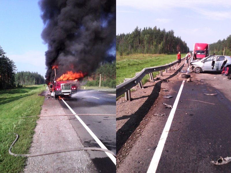 «В 9:07 большегруз с бананами по касательной столкнулся с легковым автомобилем. От удара фура загорелась, пострадали водитель и пассажир легковушки», - цитирует ИА «СеверИнформ» сообщение из социальной сети менеджера по связям с общественностью Упрдор «Холмогоры» Елены Москалевой.