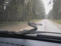 Молодая пара из Череповца повстречались со змеей во время движения вблизи лесополосы. Рептилия неожиданно оказалась на их машине.