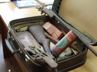 При разборе мусора пенсионер увидел чемодан, а в нем банку с надписью "Охотничий порох", два предмета, похожих на приклад с ударно-спусковым механизмом, три коробки с капсюлями воспламенителями. Сверху лежал ржавый ствол от ружья.