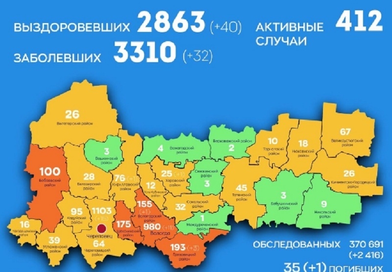 Актуальная информация о заболеваемости коронавирусом опубликована на официальной странице губернатора Вологодской области. За последние сутки выявлено 32 новых случая, зафиксирован один летальный исход. Таким образом, число погибших от инфекции достигло 35 человек.