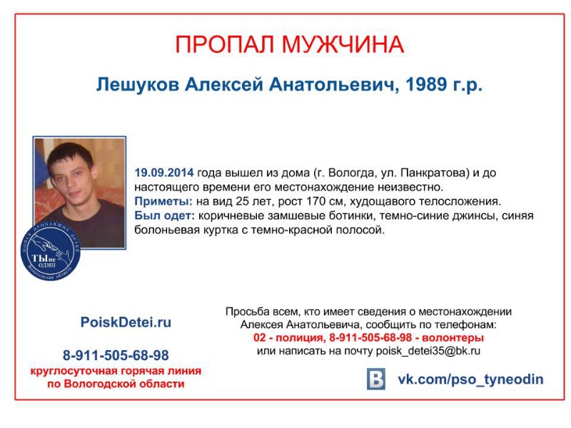 В Вологде пропал молодой человек. О нем нет вестей уже больше недели. 25-летний Алексей Лешуков ушел из дома с улицы Панкратова областного центра еще 19 сентября. С тех пор о его местонахождении ничего не известно.