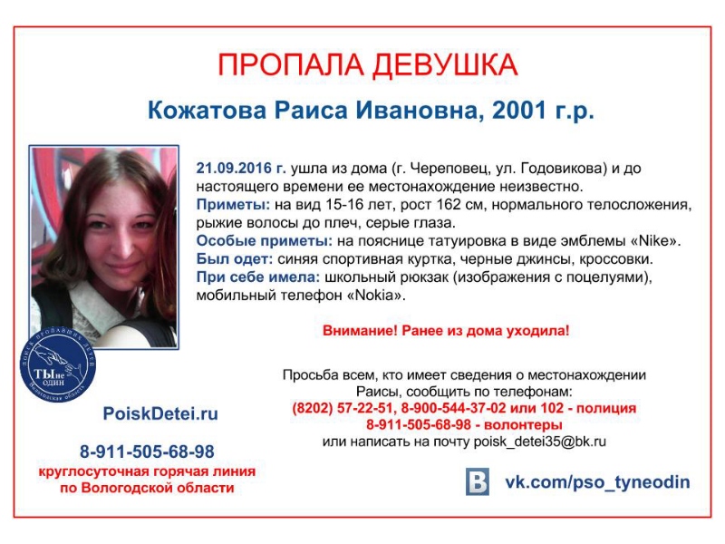 На вид пропавшей 15-16 лет, рост её составляет 162 сантиметра, телосложение нормальное, волосы рыжего цвета до плеч, глаза серые. В день исчезновения была одета в синюю спортивную куртку, чёрные джинсы и кроссовки. При себе у неё были школьный рюкзак и мобильный телефон. В качестве особой приметы можно указать татуировку на пояснице в виде эмблемы "Nike", сообщает ИА "СеверИнформ" со ссылкой на ПСО "Ты не один". Отметим, ранее девушка уже уходила из дома.