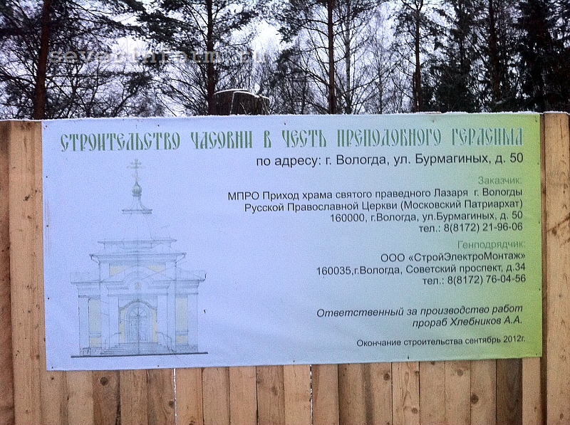 Отметим, что возведение часовни началось несколько месяцев назад по инициативе прихода Лазаревского храма и с благословения владыки Максимилиана, Епископа Вологодского и Великоустюгского. Строительство ведётся на пожертвования прихожан. Изначально планировалось, что часовня будет закончена к сентябрю следующего года. Однако сегодня Евгений Шулепов призвал возвести часовню раньше - уже к юбилейному Дню города (летом 2012 года Вологда отметит 865-летие) - и обратился к вологжанам с просьбой помочь в строительстве своими пожертвованиями. Отметим, что пример в этом намерены показать уже в ближайшие дни все сотрудники Администрации города.