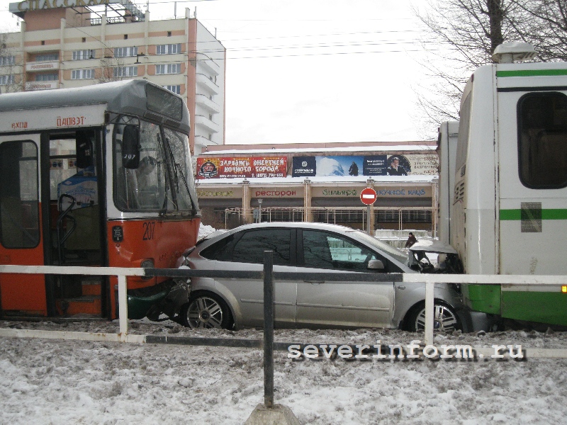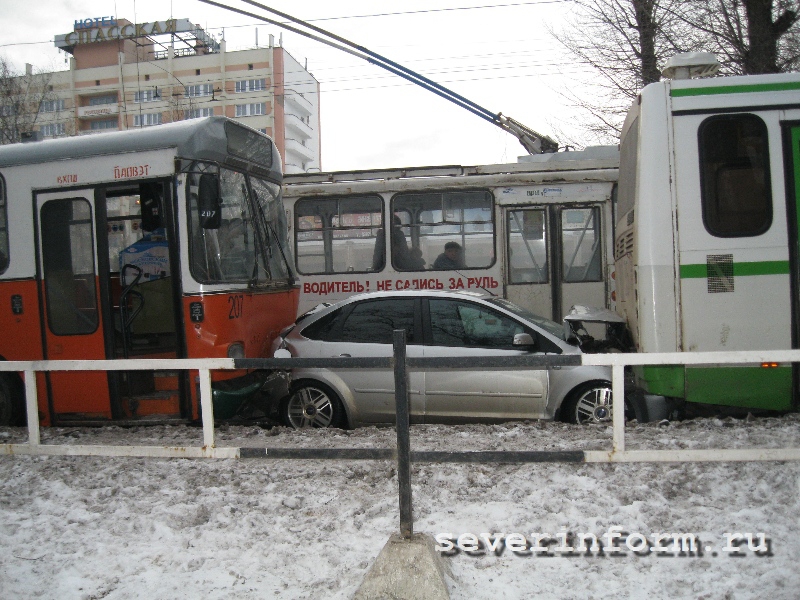 Автобус и троллейбус в Вологде смяли «легковушку»